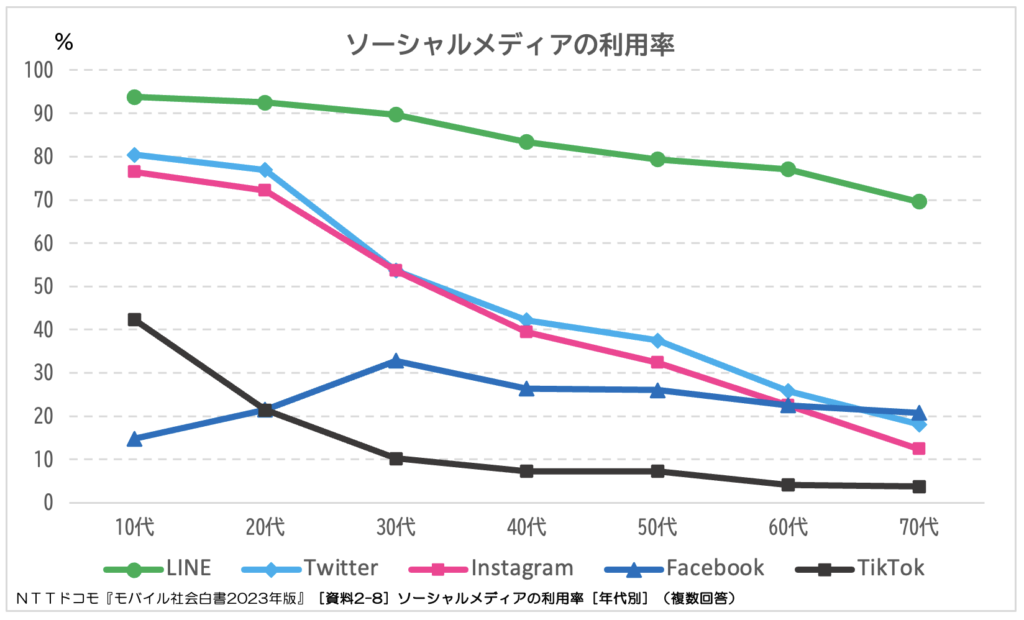10代から60代までの広い年代にわたって、Twitterは上位に位置づいています。LINEが個別のメッセージ送信に特化していることを考えれば、情報を発信したり得るツールとしてはTwitterが優位だということがわかります。