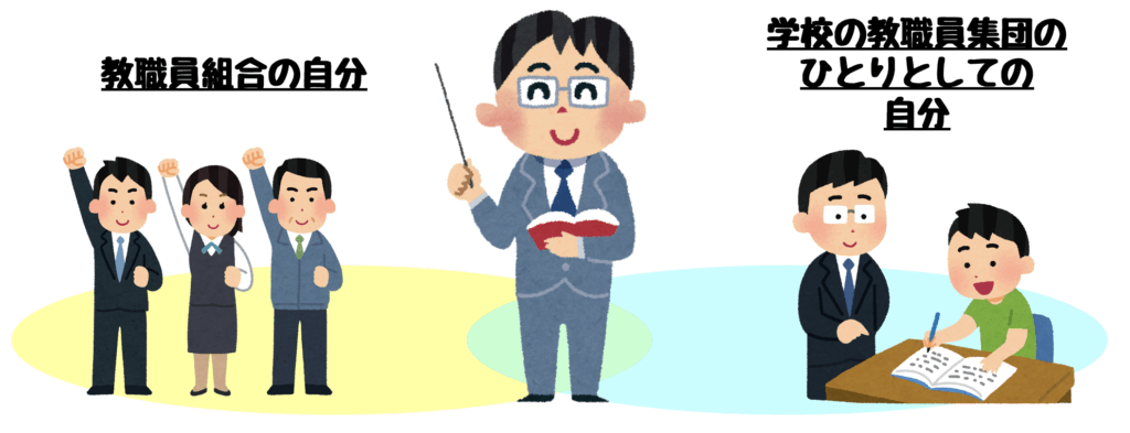 たとえ、職場の先生全員が教職員組合に集っていてみんなで「これが大事!」と思ってるとしても、公に行われる学校運営における意思決定の場は尊重されなければならない、というのが「区別」。管理職も含めて改めて共に理解をし合う気遣いが必要だということです。