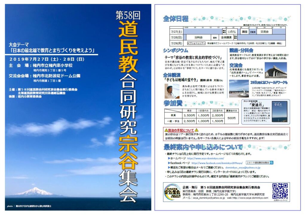 また、教職員組合からちょっと離れて2019年は道民教が稚内で全道集会を行いました。その事務局長を務めたことから、全体パンフを作成したりしていました。これも「Inkar-us-pe」につづき、コンセプトは宗谷の美しさです。