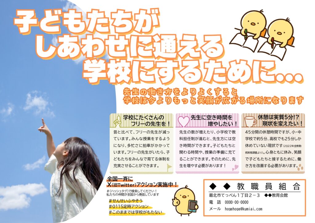 だから、道教組オリジナルで街頭宣伝チラシを作りました。1月15日には札幌や旭川をはじめ、道内各地でこのチラシを活用した街頭宣伝が行われています。